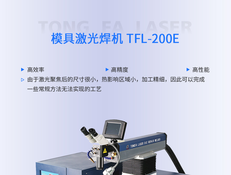出口型模具激光焊機是通發激光公司專門為出口國外客戶使用而設計的系列機型TFL-200E,適用于各類精密注塑模具、壓鑄模具等模具激光修補焊接;同時也適合鑄件沙孔激光修補、模具崩缺激光修復、過切加工等的激光修補;各類金屬結構件、金銀首飾的激光焊接加工。