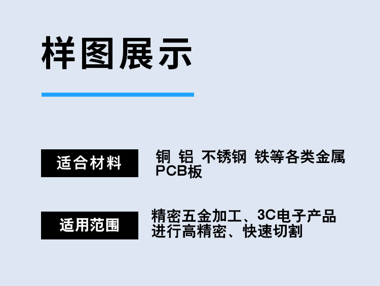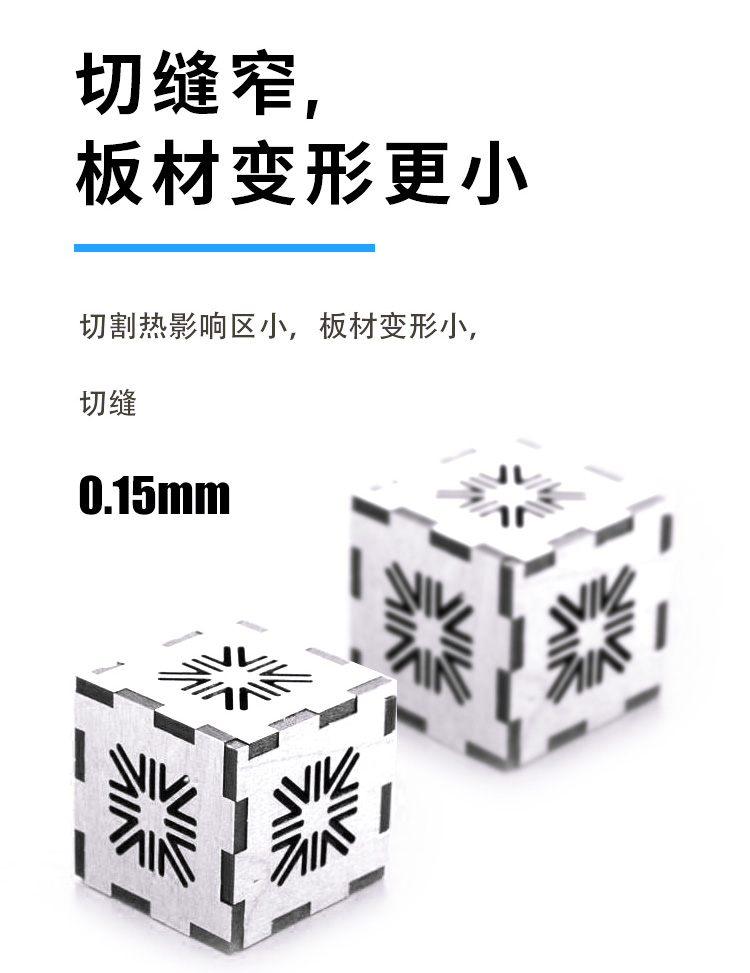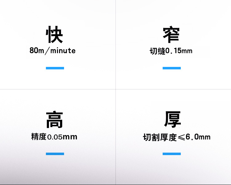 適用范圍廣,可加工銅、鋁、不銹鋼、鐵、pcb板、磁性材料等多鐘材料。幅面大小可選,長度可根據(jù)用戶加工需求定制。切割速度快,效果光滑平整,切口沒有機械應力,光滑平整無剪切毛刺。